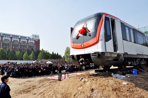 2011年10月14日上午,山東省首輛城軌車輛教學實訓車——“山職號”正式落戶山東職業學院。在落車儀式上,學院黨委書記劉邦治為“山職號”順利落車致詞,院長鄧洪基代表學院接過象征開啟列車的金鑰匙,并登車按下“山職號”啟動電源。學院領導馬文卿、徐冬、馬慶渭、祝瑞花、祝介安與南京海天軌道車輛裝備有限公司副總經理王均銀共同出席落車儀式。
