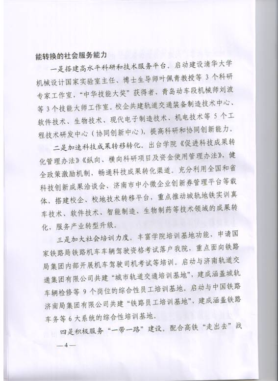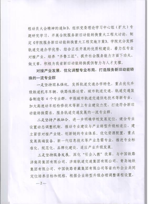 省委、省政府啟動實施新舊動能轉換重大工程以來,學院積極響應、主動對標,根據鄧廳長來校調研時的工作要求,深入調研、先行先干,迅速掀起投入服務新舊動能轉換重大工程的熱潮。學院把服務新舊動能轉換重大工程做為2018年工作的主題,成立服務新舊動能轉換重大工程行動領導小組,印發《關于認真學習貫徹山東省全面展開新舊動能轉換重大工程動員大會精神的通知》,組織黨委理論學習中心組(擴大)專題研究學習,開展服務新舊動能轉換重大工程大討論,制定《學院服務新舊動能轉換重大工程實施方案》。學院充分發揮軌道交通辦學優勢,結合正在開展的優質校建設,著力在專業對接產業、培養“齊魯工匠”、提升社會服務能力方面下功夫、做文章,積極為我省新舊動能轉換提供智力與人才支撐。