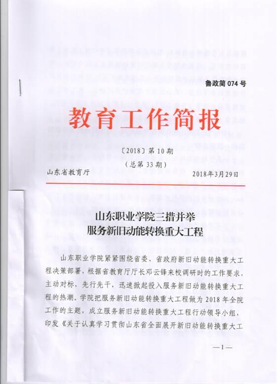 近日,我院向省教育廳報送《三措并舉 服務新舊動能轉換重大工程》簡報,獲省教育廳廳長鄧云鋒充分肯定。鄧廳長批示:“很好,可將山職院的經驗做法以省廳簡報名義轉發,供其他院校學習借鑒”。3月29日,省教育廳《教育工作簡報》(魯政簡074號)全文轉發我院簡報。