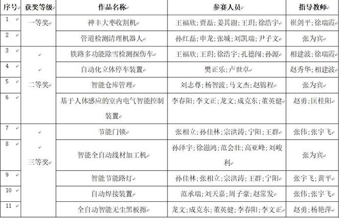 經過賽前挑燈夜戰對機器人進行設計和反復的調試,賽場上出色發揮,最終,由崔劍平、徐瑞霞老師指導,王福欣、賈磊、姜其澍、王玥、徐浩宇等五位同學制作的《神豐大棗收割機》獲主題采摘項目一等獎,由張為賓老師指導,孫紅磊、申龍、張城、劉凱瑞、尹子文等五位同學制作的《管道檢測清理機器人》獲創意展示項目一等獎。《鐵路多功能除雪檢測探傷車》《自動化立體停車裝置》《智能倉庫管理》《基于人體感應的室內電氣智能控制裝置》等四個作品獲大賽二等獎,《節能門鎖》《智能全自動線材加工機》《智能節能路燈》《自動焊接裝置》《全自動智能無塵黑板擦》等五個作品獲大賽三等獎。