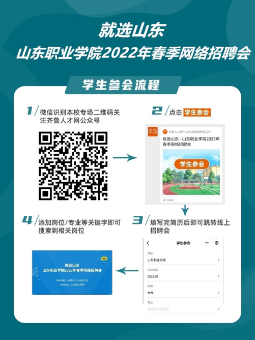 為認真貫徹黨中央、國務院“穩就業”“保就業”決策部署,按照國家及山東省關于做好高校畢業生就業創業工作的有關通知要求,克服近期疫情多點散發對畢業生就業帶來的不利影響,促進畢業生更加充分和更高質量就業,我校擬舉辦就選山東·山東職業學院2022屆畢業生春季網絡招聘會,誠邀貴單位參加。