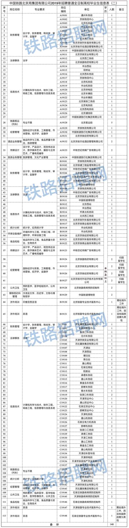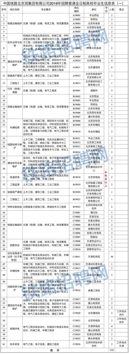140人!中國鐵路北京局集團有限公司2019年招聘全日制普通高校畢業生公告(二)