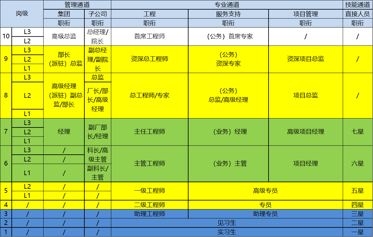 公司開辟了多通道的職業發展路徑,開辟了橫向和縱向的發展通道,為員工職業發展提供了更大的空間;每一層級都有任職要求及標準,實現了員工事其所好,精其所專,得其所值,知其所往。具體詳見下表: