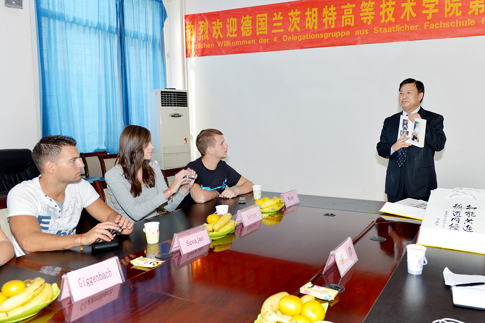 歡迎儀式上,劉邦治向來訪的師生們贈送由我院和《中華傳統美德》叢書編委會聯合編撰的《中華傳統美德警句名言》書籍,并對書籍內容作了簡要介紹。劉邦治表示,德國蘭茨胡特高等技術學院是山東職業學院加強國際間文化、學術、技術交流與合作的重要合作院校。在前期順利開展的六次師生互訪活動中,雙方師生共同生活,并肩學習,增進了了解,加深了友誼,開拓了視野。