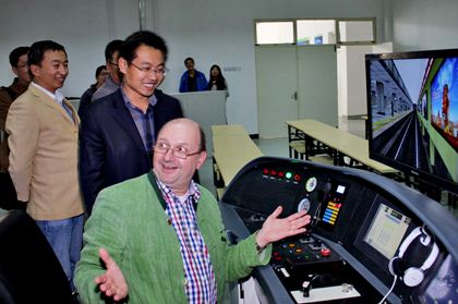 講座結束后,艾格納校長一行在教務處處長郭鵬的陪同下到機械工程系、機電裝備系、電氣工程系與軌道交通學院的實驗實訓室進行了實地考察。在參觀軌道交通學院實訓室過程中,艾格納校長還饒有興致地體驗了機車模擬駕駛。