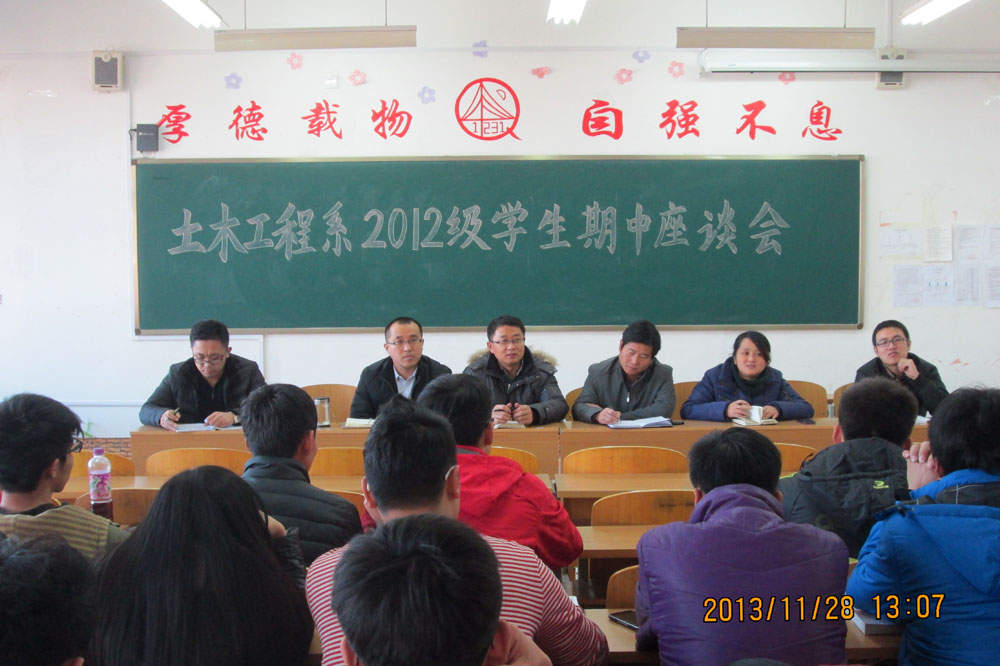 為了更好地掌握學生在校生活和學習狀況,了解教師在日常授課等方面的能力和工作表現。11月28日,土木工程系召開2012級、2013級學生期中座談會。土木工程系主任郭兆軍,黨總支書記徐曉東,副主任步文萍、李曉良,學工辦主任兼團總支書記劉林,專業教師柴振波出席了大會。