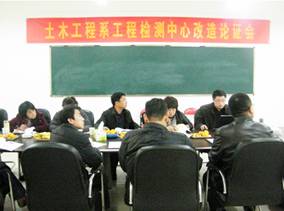 2012年11月13日土木工程系召開工程檢測中心改造論證會,邀請到濟南魯建工程質量檢測公司主任楊瑞友、山東建筑大學交通學院道路實驗室主任耿立濤博士、山東職業學院副院長祝瑞花、教務處周朋紅教授就土木工程系工程檢測中心擴建改造工程進行論證。土木工程系主任郭兆軍,土木工程系副主任步文萍、李曉良參加論證會。會議由李曉良主持。