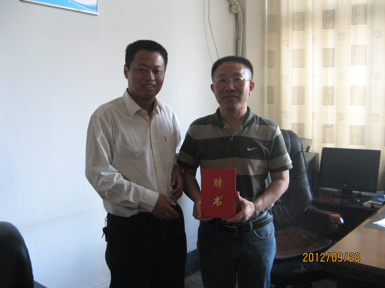 隨后三位老師來到濟南鐵路局供電段走訪了褚光亮副段長。林毓梁主任向褚段長介紹了電氣化鐵道技術專業的建設情況和2012年“兩會”的籌備情況,并代表電氣工程系向褚段長頒發聘書,正式聘請褚段長為副主任委員。褚段長表示,通過跟山東職業學院合作,供電段的技術人員可以重新加深理論學習,并回實驗室親自動手操作、拆裝儀器設備;學生則可以深入鐵路企業一線熟悉各種在實驗室見不到的裝置和設備。鐵路供電崗位一線熟練工一般需要經過六個月的培訓才能正式持證上崗,而如果學生在學校就經過這樣的培訓,畢業后就可以直接上崗,為企業節省了時間并減少了很多教育和培訓成本,雙方互惠互利。褚段長邀請我們系的教師去現場參觀學習,并表示,他會定期派供電段的技術人員來校帶領學生進行實驗實訓,并將對電氣化鐵道技術專業和供用電專業的課程設置和實驗實訓室建設提出有建設性的意見。