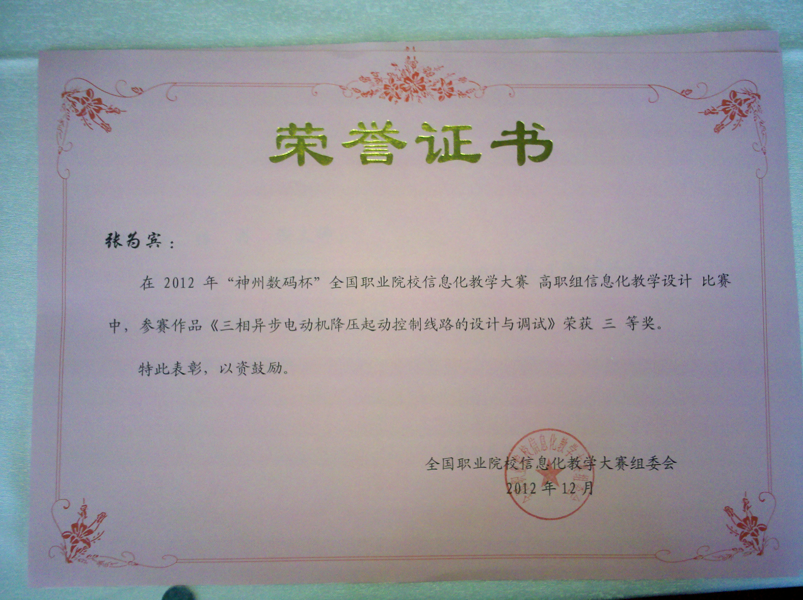 2012127日至20121210日,2012神州數碼杯全國職業院校信息化教學大賽在南京高等職業技術學校舉行,本次大賽由教育部職業教育與成人教育司、工業和信息化部人事教育司和江蘇省教育廳共同組織。機電裝備系老師張為賓代表我院參加了此次比賽,參賽作品是《三相異步電動機降壓起動控制線路的設計與調試》,并憑借色的現場解說及答辯,最終獲得了三等獎。