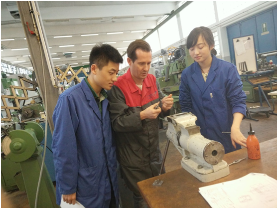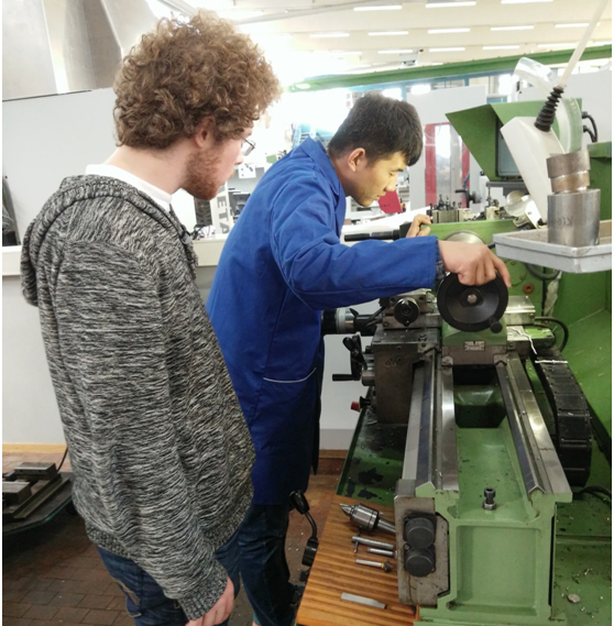 項目合作以車床模型的設計與制作為載體,德中學生三個人為一個小組合作進行車床模型項目的設計、零件加工、鉆孔、裝配、電路設計及焊接、整體調試等整個過程,在雙方老師的幫助下,學生克服交流困難,成功完成整個項目的合作,并且在這個過程中還相互學習到很多更好的解決問題的方法。