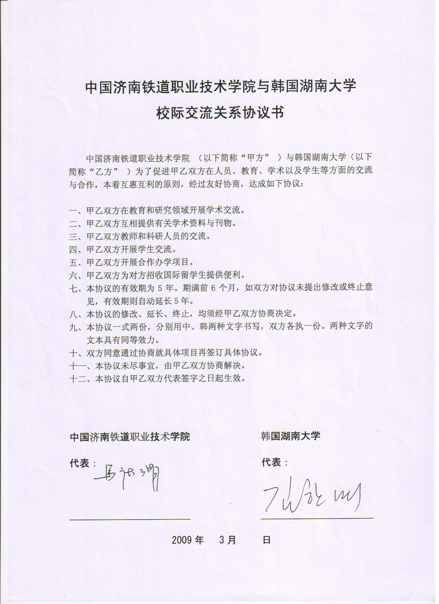 山東職業學院與韓國湖南大學校際交流關系協議書
