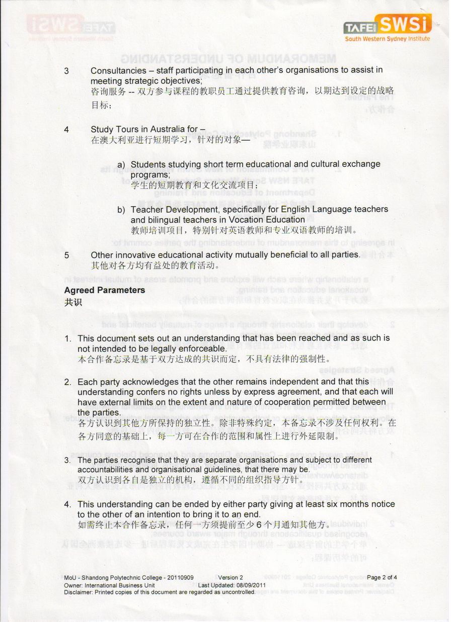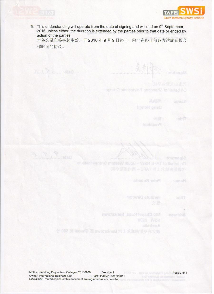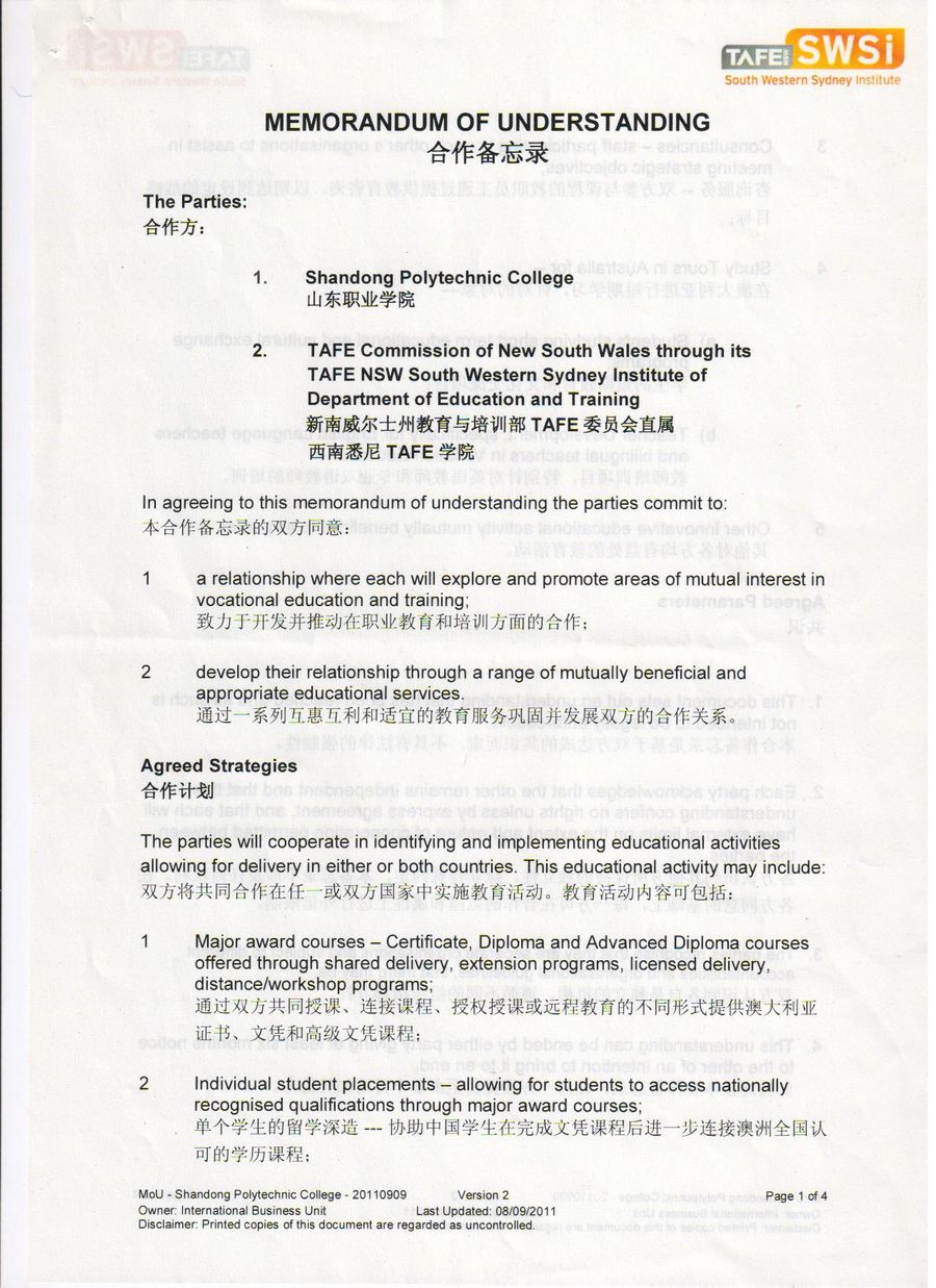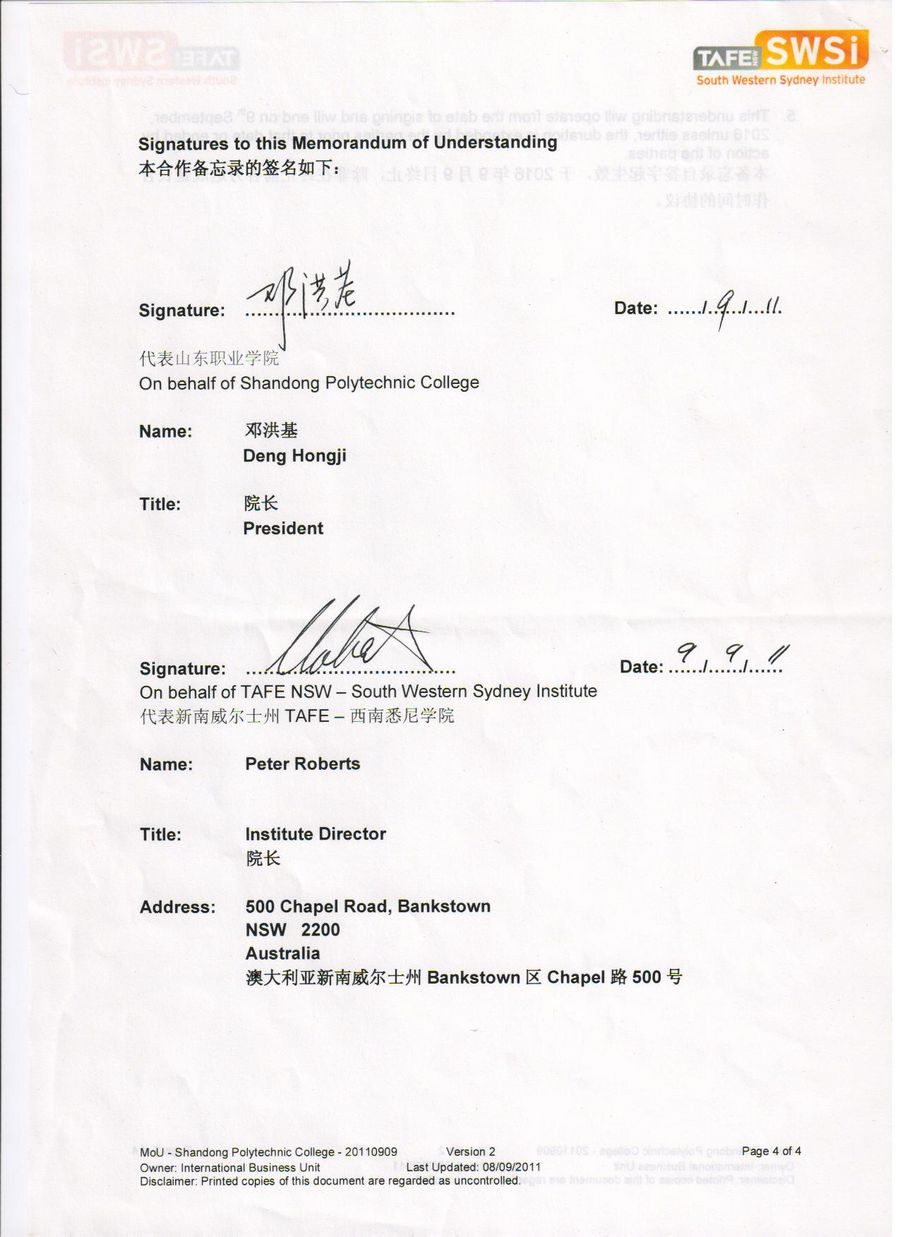 山東職業學院與西南悉尼TAFE學院合作備忘錄