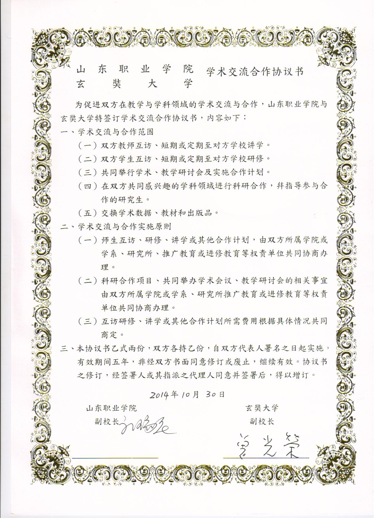 山東職業學院玄奘大學學術合作議定書