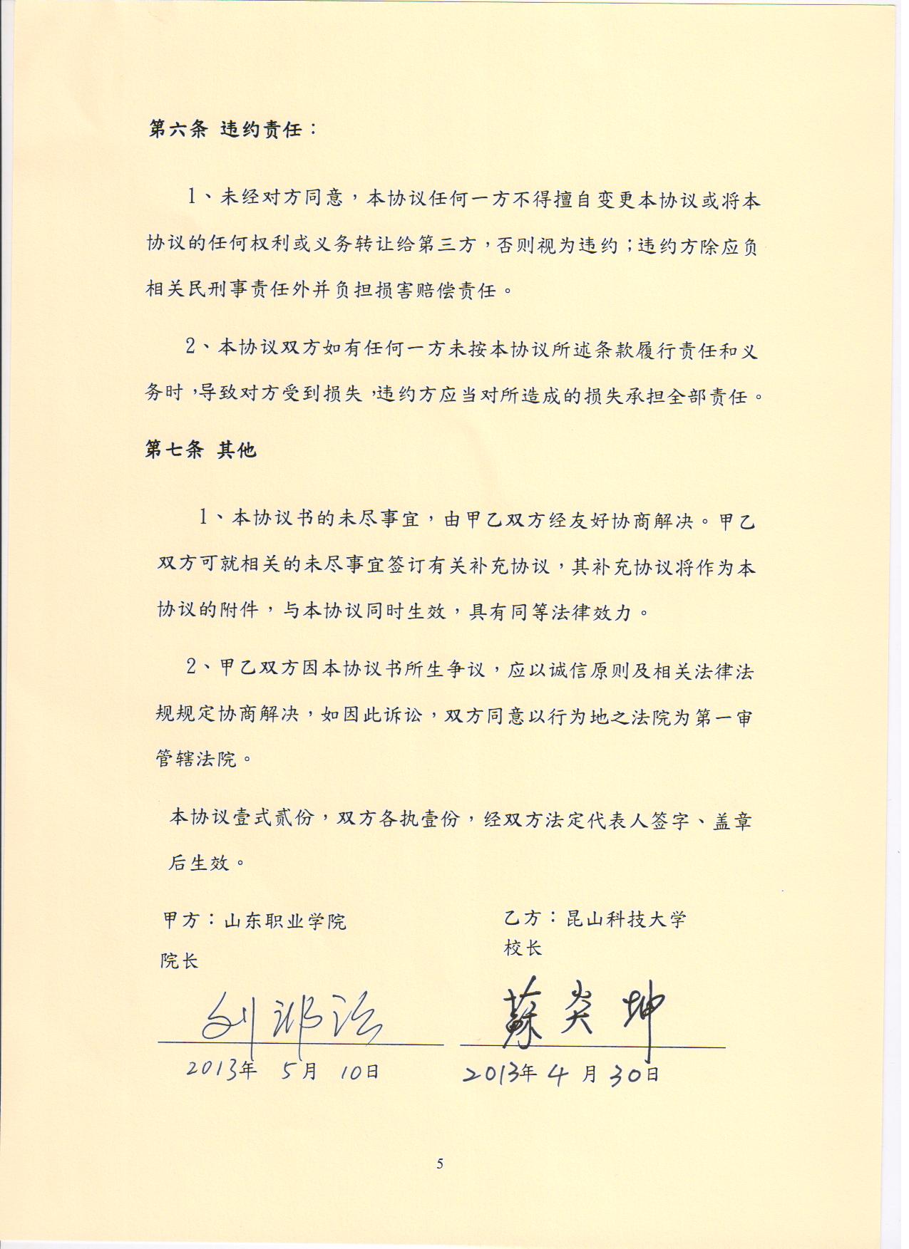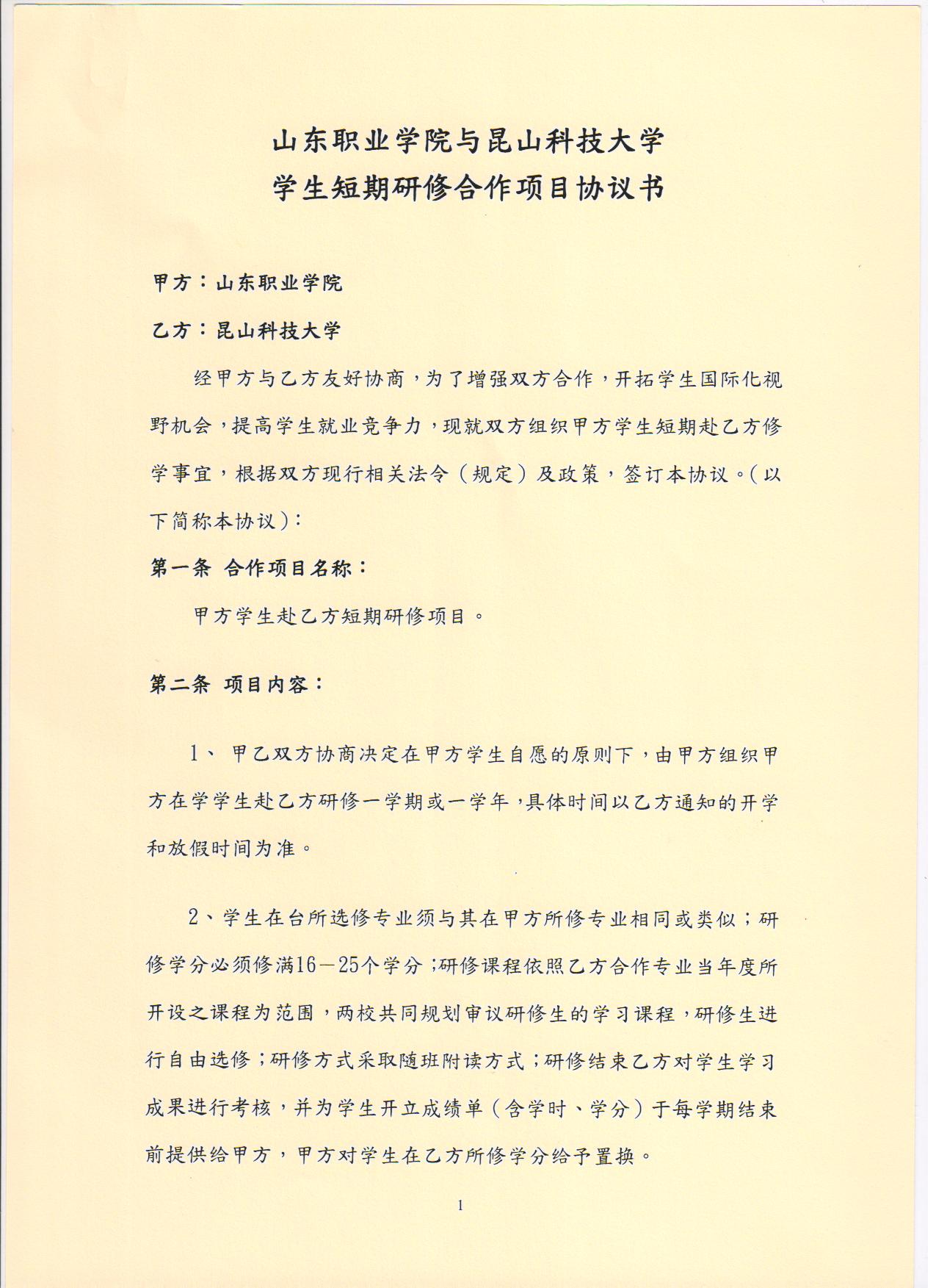 山東職業學院與昆山科技大學學生短期研修合作項目協議書