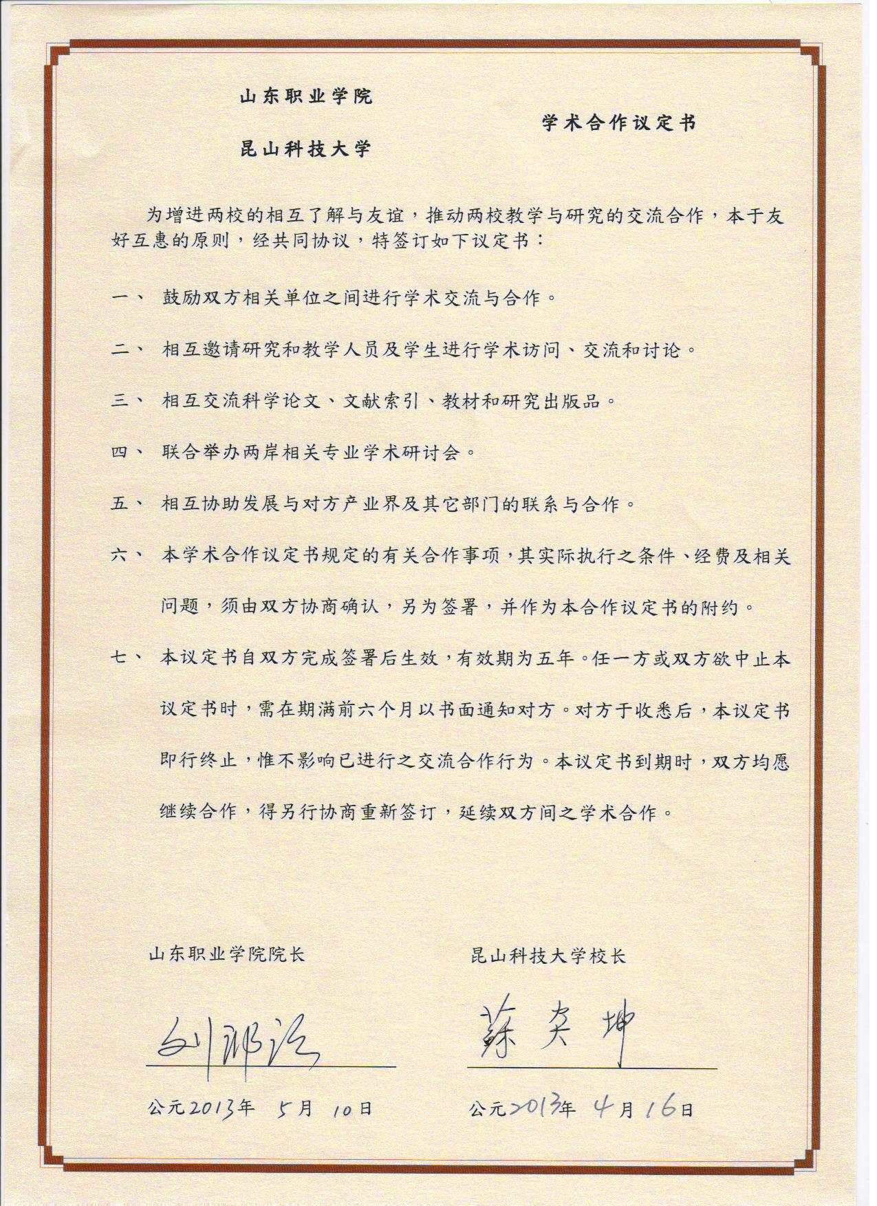 山東職業學院昆山科技大學學術合作議定書