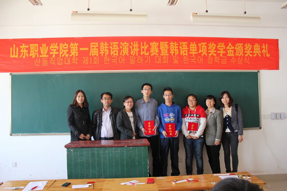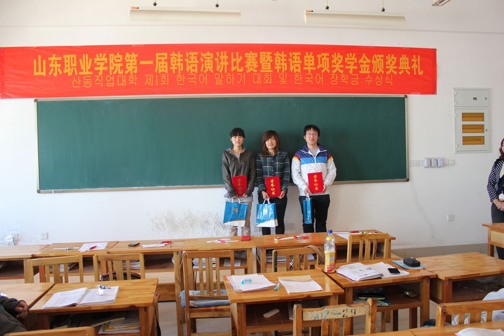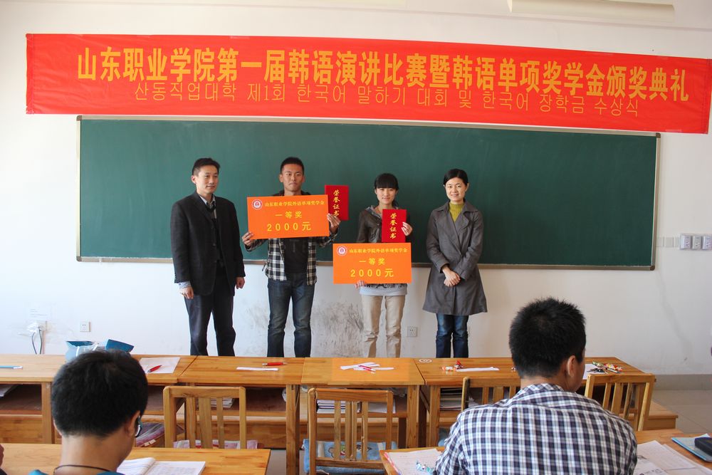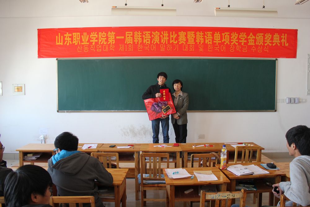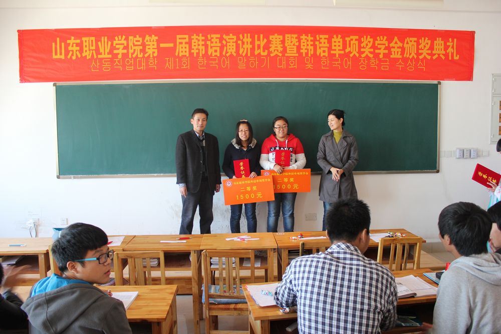 演講比賽結束后,舉行了山東職業學院韓語單項獎學金頒獎典禮。教務處副處長張守忠、張欣作為頒獎嘉賓,為獲得韓語單項獎學金的學生們頒了獎。