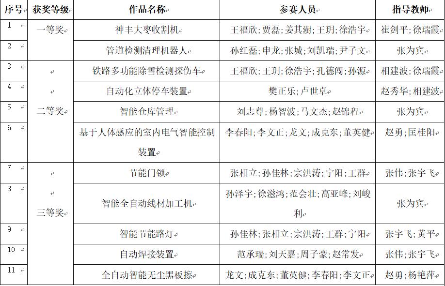 經過賽前挑燈夜戰對機器人進行設計和反復的調試,賽場上出色發揮,最終,由崔劍平、徐瑞霞老師指導,王福欣、賈磊、姜其澍、王玥、徐浩宇等五位同學制作的《神豐大棗收割機》獲主題采摘項目一等獎,由張為賓老師指導,孫紅磊、申龍、張城、劉凱瑞、尹子文等五位同學制作的《管道檢測清理機器人》獲創意展示項目一等獎。《鐵路多功能除雪檢測探傷車》《自動化立體停車裝置》《智能倉庫管理》《基于人體感應的室內電氣智能控制裝置》等四個作品獲大賽二等獎,《節能門鎖》《智能全自動線材加工機》《智能節能路燈》《自動焊接裝置》《全自動智能無塵黑板擦》等五個作品獲大賽三等獎。