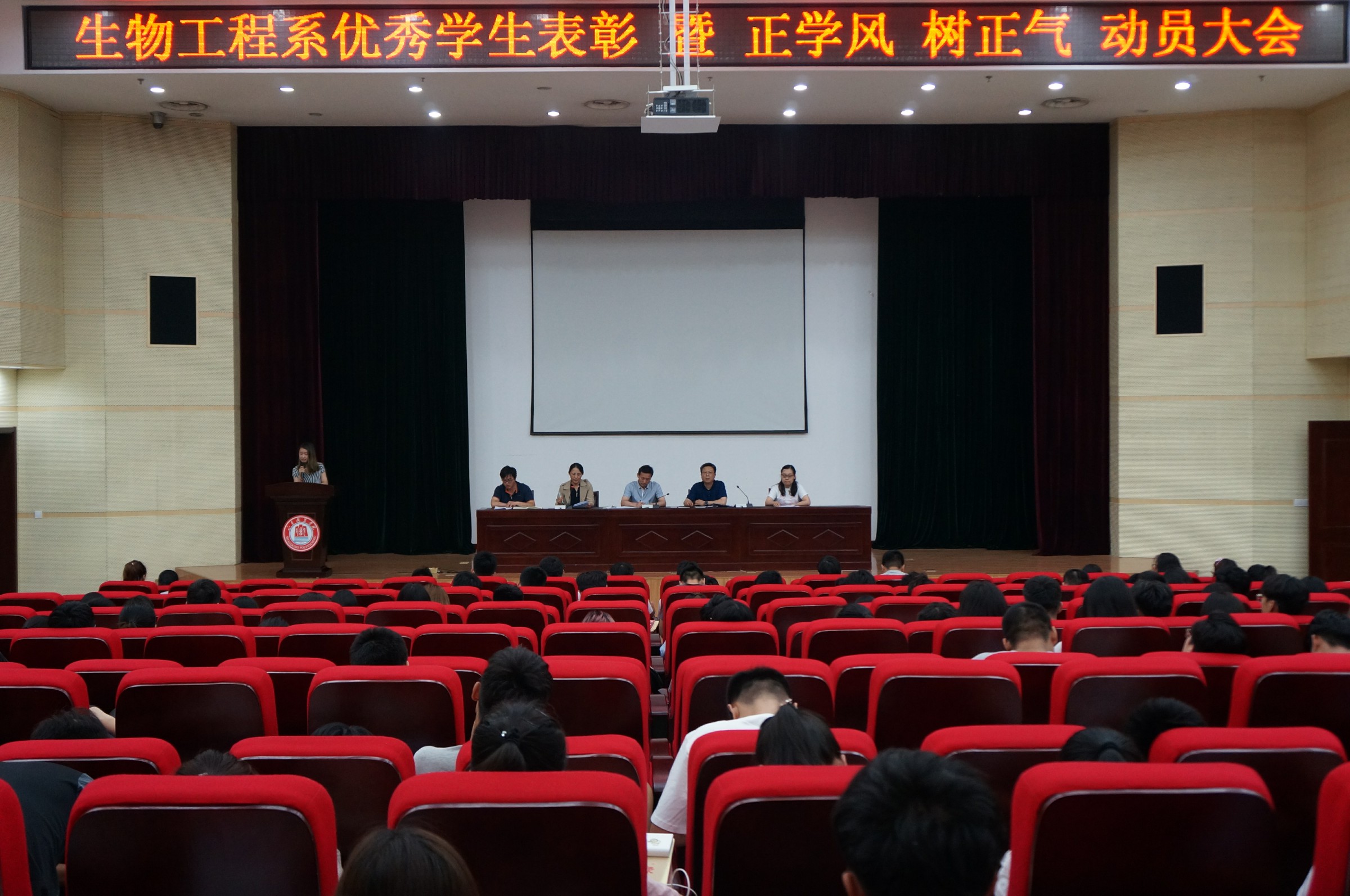 臨近期末,生物工程系召開優秀學生表彰暨正學風、樹正氣動員大會。系主任張守忠、黨總支書記王廣勇、副主任史曉華、團總支書記張樂、輔導員李啟迪出席會議,史曉華主持大會。