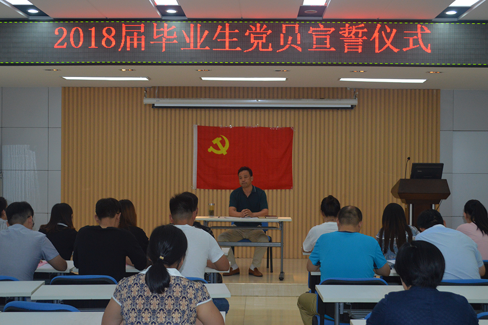 宣誓儀式后,呂鵬與畢業生黨員進行了座談交流,并作了《爭做新時代合格黨員》專題黨課。他從什么是新時代合格黨員的“四講四有”標準談起,希望同學們時刻牢記自己的黨員身份,不忘初心,牢記使命,不斷提高黨性修養,努力踐行社會主義核心價值觀,弘揚中華民族優秀傳統文化。隨后,對怎樣做新時代的合格黨員提出建議,要求同學們要對照黨章加強黨性修養,要深入學習習近平新時代中國特色社會主義思想,要學習黨內法規制度,要加強組織觀念和紀律觀念,要堅定信念,嚴于律己,要加強宗旨意識和責任意識,全心全意為人民服務。此次宣誓儀式使新黨員深深體會到自己責任與使命,在他們成長的道路上具有深遠意義。