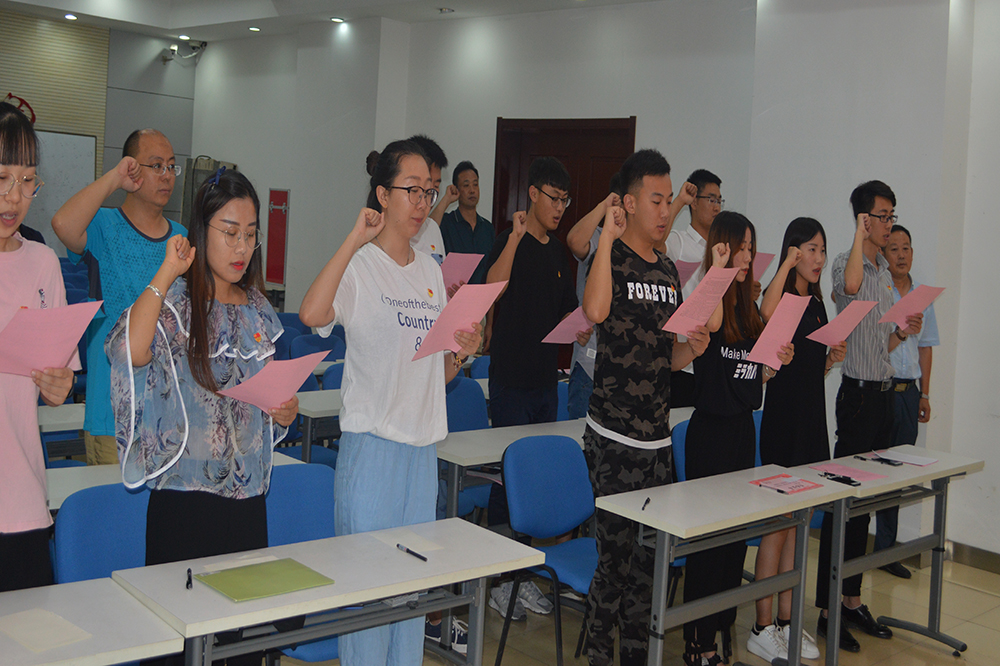 宣誓儀式在激昂的《國際歌》聲中拉開序幕,新發展的黨員面向黨旗,舉起右手,在領誓人領讀下莊嚴宣誓,表達對黨的忠誠與熱愛,以及為共產主義事業奮斗終身的決心。