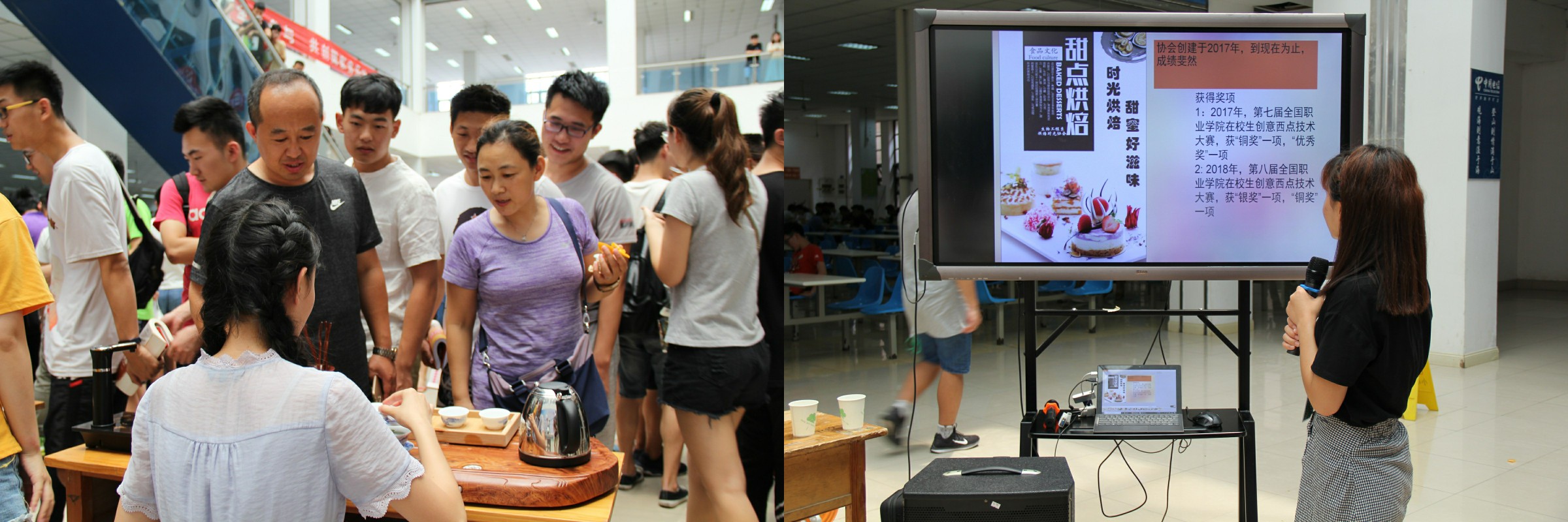 今天活動的主題是“秀技能、展風采”,生物工程系學生現場進行了蛋糕裱花、水果拼盤制作、茶藝表演等技能展示,活動現場氣氛熱烈,選手們盡情發揮創意,精雕細琢。他們或切、或拼忙得不亦樂乎。蛋糕、奶油、西瓜、蘋果、芒果、香蕉等各種食材,在選手們的創意下,拼放成各種圖案,作品色彩艷麗、精美絕倫。同學們細心謹慎、嚴謹規范的操作,讓一件件精美的創意作品展示在師生眼前。優美的樂曲、美輪美奐的表演,讓廣大師生沉浸在美食美味的誘惑中,忍不住伸出手、張開嘴,享受美食的盛宴。