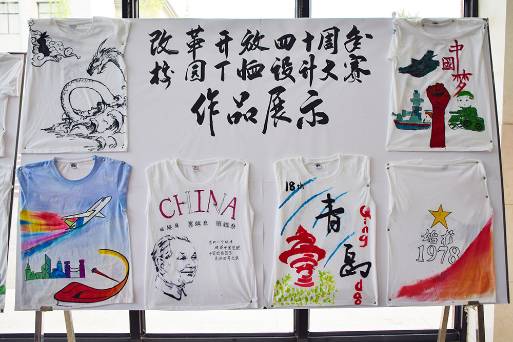 神舟玉兔天宮,高鐵支付寶共享單車,世博會奧運會青島峰會……13件手繪T恤圍繞40年來家與國緊密相連的生活變化和時代變遷,以小見大,見微知著,講述改革開放中發生的精彩故事,展現文明古國的歷史文化,謳歌英雄人物的豐功偉績,贊頌美好生活的和諧安寧,詮釋了青年學子對改革開放40年的深刻理解和對青春中國夢的美好憧憬。