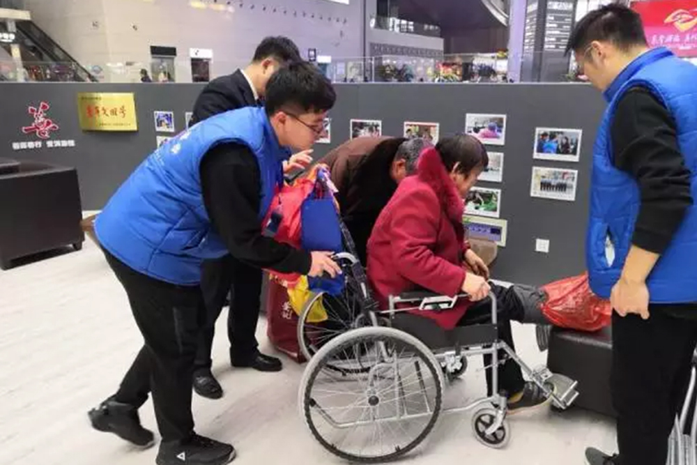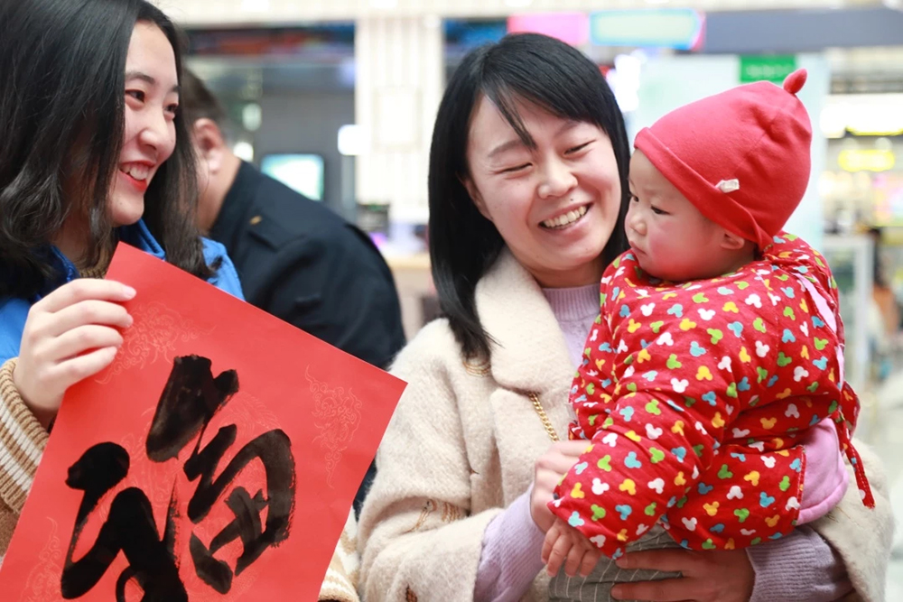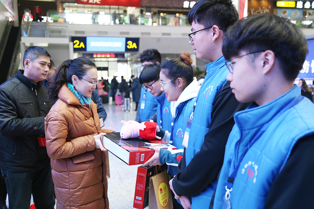 引導旅客有序排隊、幫助旅客自助取票、解答旅客信息咨詢、協助老幼病殘孕旅客便捷進站……青春可愛的志愿者們在為旅客帶來優質服務的同時,也用不一樣的方式為緊張的“春運”增添了無限暖意。1月21日是春運首日,二十多名志愿者立崗服務的樣子亮相山東公共頻道,記者形容他們為“濟南東站的流動的藍色風景線”。同一天,志愿者與濟南西站職工攜手在候車大廳內的“快閃”視頻“刷屏”網絡,他們用嘹亮的歌喉與輕快的舞蹈喜迎濟南東站首次參與“春運”熱潮。1月23日,志愿者與鐵路局職工再次攜手,為乘客送上“福”字,一副副寓意喜慶的大紅“福”字,帶著美好的祝福飛進千家萬戶,給濟南西站帶去了濃濃的年味。