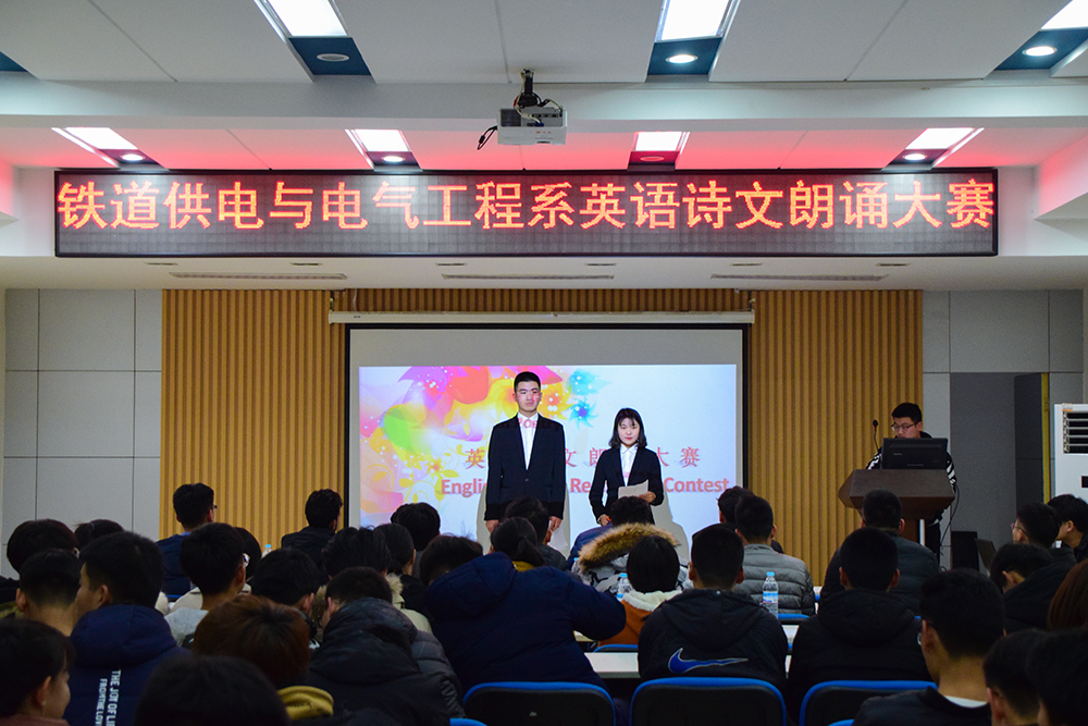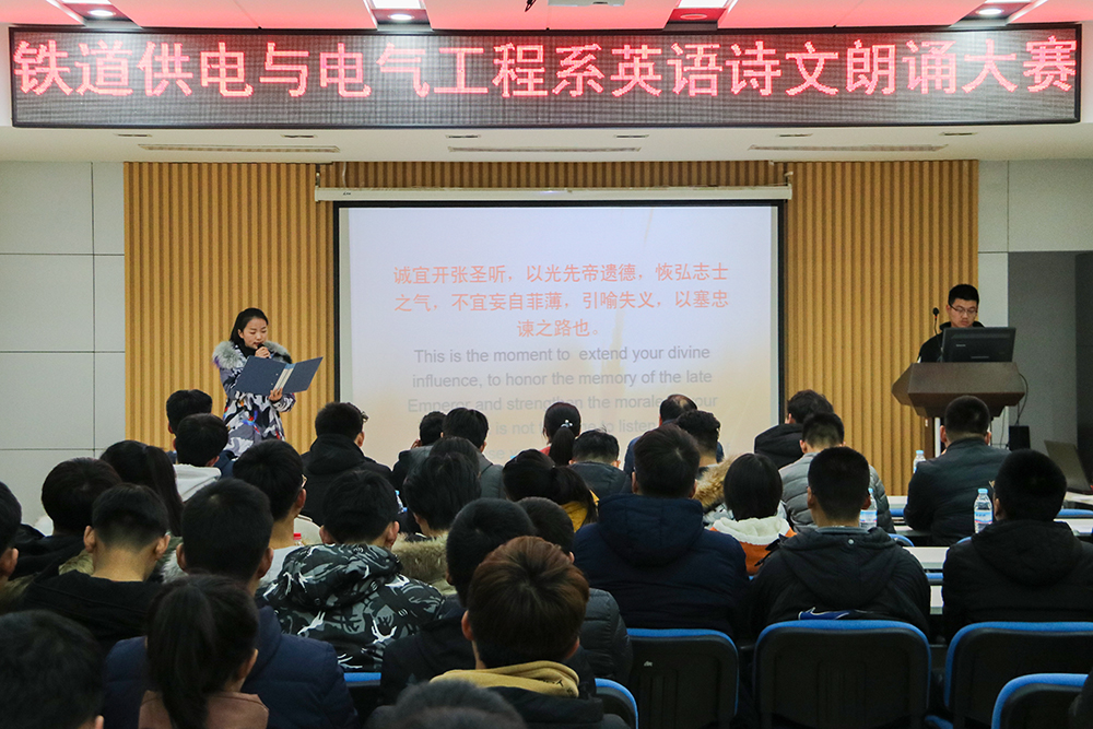 近期,鐵道供電與電氣工程系舉辦了英語詩文朗誦大賽,活動吸引了大二、大三年級眾多英語愛好者參加。比賽現場,選手以標準的發音、熟練的表達、優雅的臺風,展現出對英語的熱愛和執著,紛紛拿出看家本領,從散發濃郁歷史氣息的《出師表》到富有精神信仰的《I have a dream》,從感情真摯的《致朋友》到當代“詩圣”的《飛鳥集》,選材新穎獨特,富有深意。期間,外國友人以一首帶有民族風情的歌曲讓觀眾感受語言風采,享受文化魅力。最終,電氣1834班王潤禎憑借過硬的英語口語斬獲桂冠。