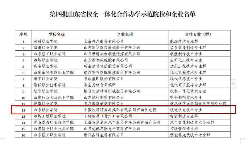 12月20日,山東省教育廳公布了《第四批山東省校企一體化合作辦學示范院校和企業》評審認定結果,我校鐵道學院與中國鐵路濟南局集團有限公司濟南供電段聯合申報的鐵道供電技術專業成功獲批。