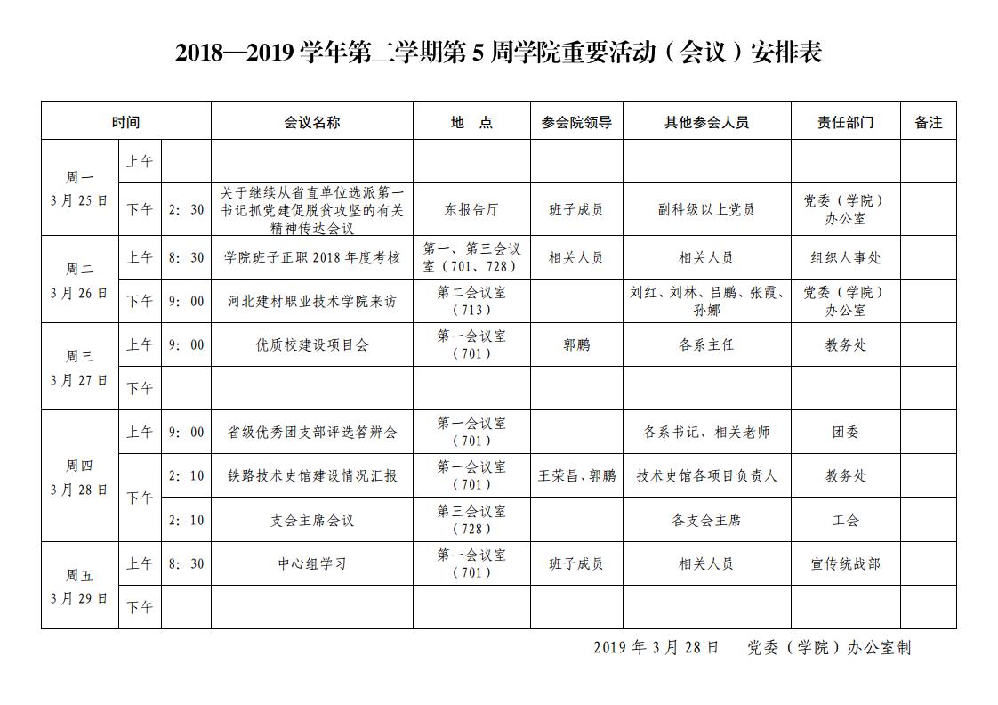 2018-2019學年第二學期第5周學院重要活動(會議)安排表