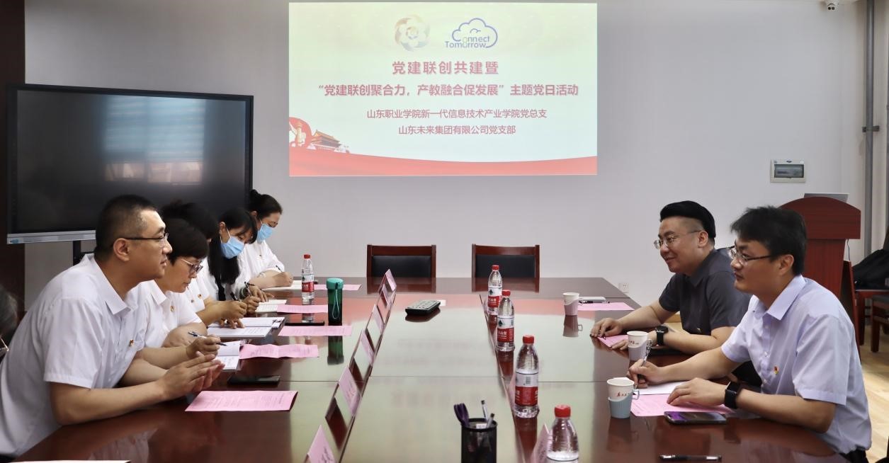 為推動學習貫徹習近平新時代中國特色社會主義思想主題教育走深走實,6月29日,新一代信息技術產業學院黨總支與山東未來集團有限公司黨支部舉行了黨建聯創共建簽約活動。山東未來集團黨支部紀檢委員、常務副總經理徐小傳,新一代信息技術產業學院黨總支書記、院長楊文虎及黨總支委員、各支部委員參加活動。