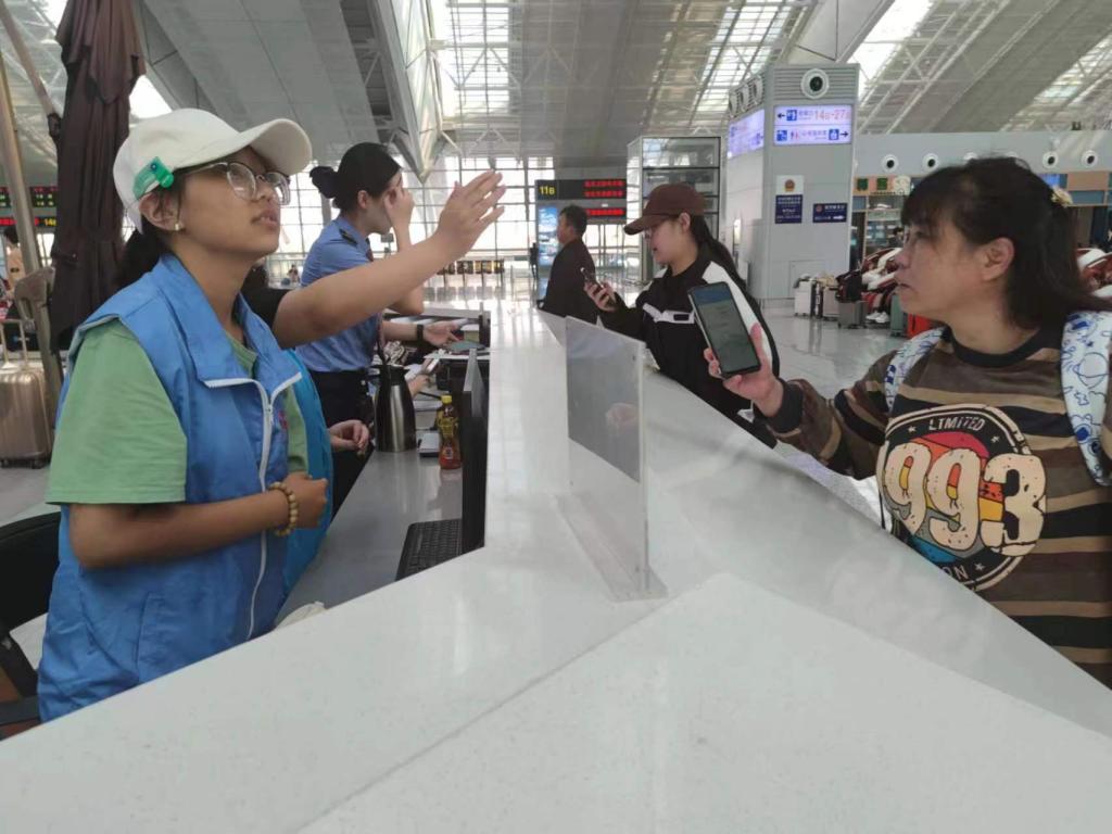 車站客服中心工作人員將兩隊志愿者分為六組。在這三天時間里,同學們懷著奉獻之心行走在志愿的道路上:檢票口,他們維持秩序,疏通乘客;候車席,他們手持喇叭,通知檢票;電梯口,他們提拿行李,答疑解惑……點點幫助匯成微光,為人民、為社會貢獻了一份光熱。