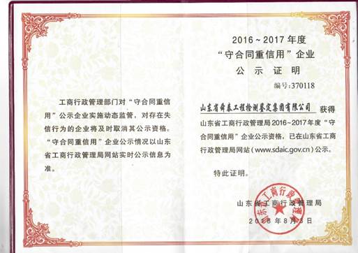 正是因為他堅持,讓集團公司得到了快速健康的發展,先后被評為山東省誠信建設示范單位、山東省服務名牌企業、山東省守合同重信用企業、濟南市服務名牌企業、濟南市守合同重信用企業等榮譽稱號。集團公司現已成為專業的工程質量檢測、鑒定、加固設計、加固施工、工程咨詢、勘察設計、環境保護為一體的綜合性技術服務型企業集團,是山東省內資質最全、技術最優、服務最好、最具誠信的獨立的第三方檢測鑒定機構之一。