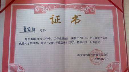 山大地緯軟件股份有限公司系統集成中心集成經理信豐波對夏家祥同學給予了充分的肯定和高度評價,并在年終總結中說:“夏家祥系統集成各項理論基礎扎實,數據庫技術問題處理能力突出。工作中積極主動,認真負責,樂于鉆研,注重提高,是系統集成中心的技術骨干力量。希望在今后的工作中繼續努力,為競聘公司即將設立的集成技術專家做好準備”。