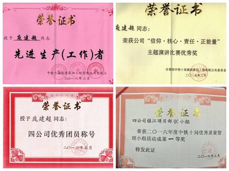 2013年9月份-2015年2月,在贛韶鐵路線路分部實習。2015年3月-2016年4月在鎮江五鳳口高架工程任技術員,學習公路橋梁鉆孔樁、承臺、墩柱、蓋梁等結構施工工藝,主要負責174米大跨度鋼箱梁拼裝、跨多條繁忙鐵路干線頂推施工,該項目產生QC成果3個,其中創新型課題“集走形與限位于一體新型滾輪小車的研發與應用”榮獲局QC發表一等獎,并上報了股份公司進行學術交流,同年該新型滾輪小車順利獲得了國家專利,大跨度鋼箱梁的順利頂推,最終該工程光榮獲得了“2016年東華地鐵公司安全優質文明工程”稱號。2016年5月份-2018年12月,擔任連云港院前路立交橋、連云港204國道立交橋項目工程部副部長并主持部門工作,負責技術管理工作,精心組織,優化方案,在施工過程中認真核對設計圖紙,做到了施工中零交通事故,得到了當地交警的好評,同時該工程被業主推薦為江蘇省平安工地,還申報了2018年度地鐵系統安全優質文明工程。2019年3月-至今,在阜陽新韓路上跨鐵路橋項目中擔任工程部部長。
