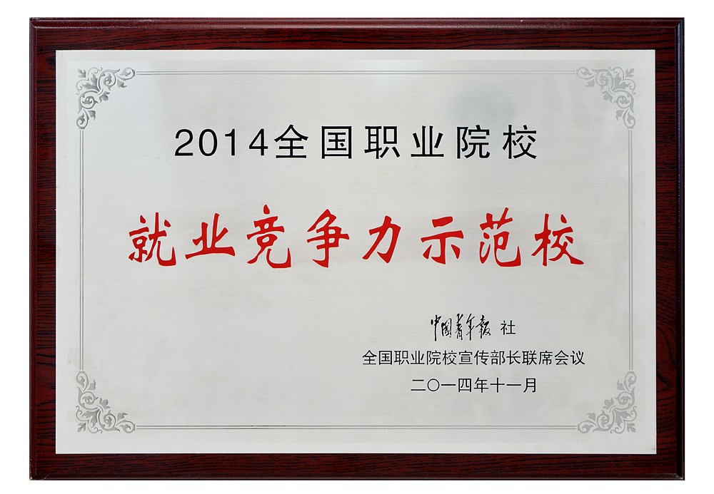 “2014全國職業院校就業競爭力示范校”推選活動由中國青年報社、全國高職高專校長聯席會議、全國職業院校宣傳部長聯席會議主辦,中青在線、中國高職高專教育網提供網絡支持,參選對象為全國高職高專院校。活動從推薦名單中遴選出30家高職院校獲得“2014全國職業院校就業競爭力示范校”稱號,授予“2014全國職業院校就業競爭力示范校”牌匾。