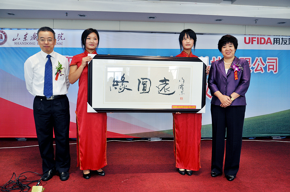 為慶祝山東職業學院與用友新道的合作,簽約儀式上,學院副院長祝瑞花與馬德富先生代表校企雙方共同接受了由用友集團副總裁徐寶東先生親自執筆,代表用友集團書寫下對雙方合作的美好祝愿。