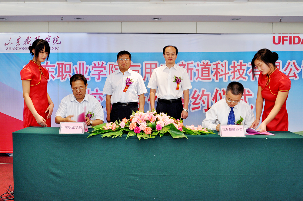 8月27日,山東職業學院與用友新道科技有限公司校企共建虛擬商業社會環境VBSE實習實訓基地簽約儀式在美麗的海港城市日照兗礦聖園酒店隆重舉行。山東職業學院黨委書記劉邦治為此次校企合作簽約儀式致賀詞。用友新道科技有限公司高級副總裁、北京市職業教育分級教學改革專家組成員馬德富先生、山東職業學院院長鄧洪基出席簽約儀式。簽約儀式由學院黨委副書記、常務副院長馬文卿主持。用友新道公司助理總裁兼院校事業部總經理宋健先生、山東分公司總經理于美玲、學院副院長徐冬、馬慶謂、祝瑞花、紀委書記祝介安、副院長焦見洋以及學院正科級以上中層干部為此次校企合作簽約儀式的隆重舉行作共同見證。