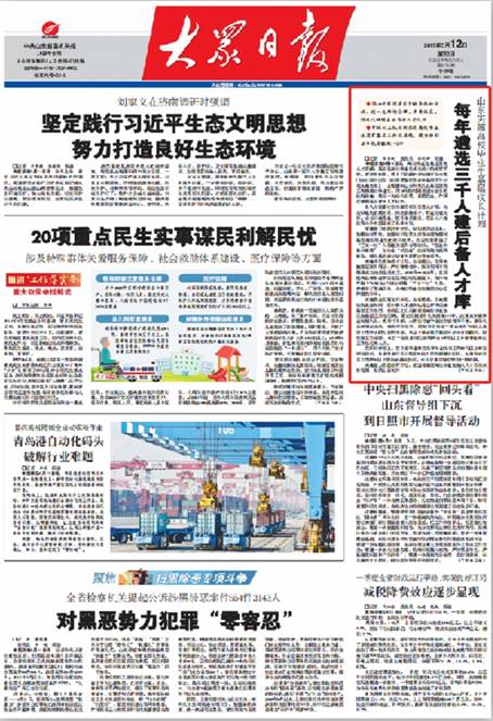 5月12日,《大眾日報》在頭版刊發文章《山東實施高校畢業生基層成長計劃 每年遴選三千人建后備人才庫》,原文如下:
