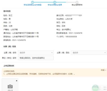 操作說明:學生如果出國,則選擇選擇出國類型,在界面按要求填寫出國信息并上傳證明材料。如有不確定信息可保存,暫不提交,確認無誤信息可保存并提交審核,也可以取消本次操作返回重新選擇就業去向。