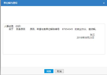 (2)單位提出解約申請:學生收到單位解約通知,同意回復即完成解約,取消則協議繼續有效。