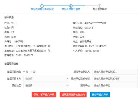 操作說明:學生如果參加國家或地方基層項目,則選擇選擇基層項目類型,在界面按要求填寫基層項目信息。如有不確定信息可保存,暫不提交,確認無誤信息可保存并提交審核,也可以取消本次操作返回重新選擇就業去向。