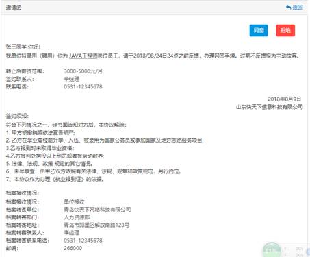 1、查看邀請函。畢業生收到單位發送的簽約邀請后,查看邀請內容,進行回復。回復同意即生成協議書,回復拒絕則邀請函無效。