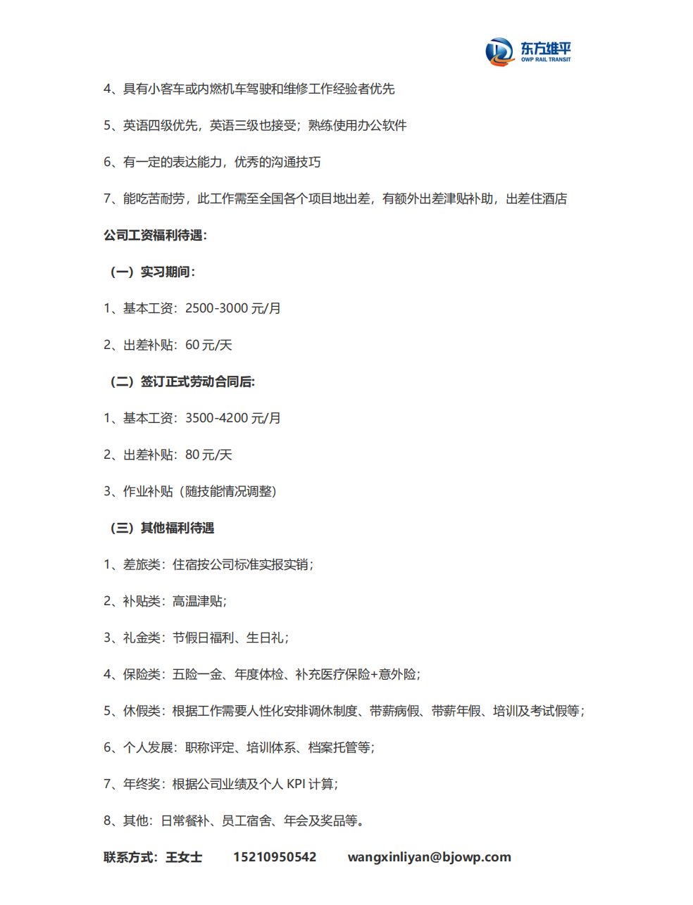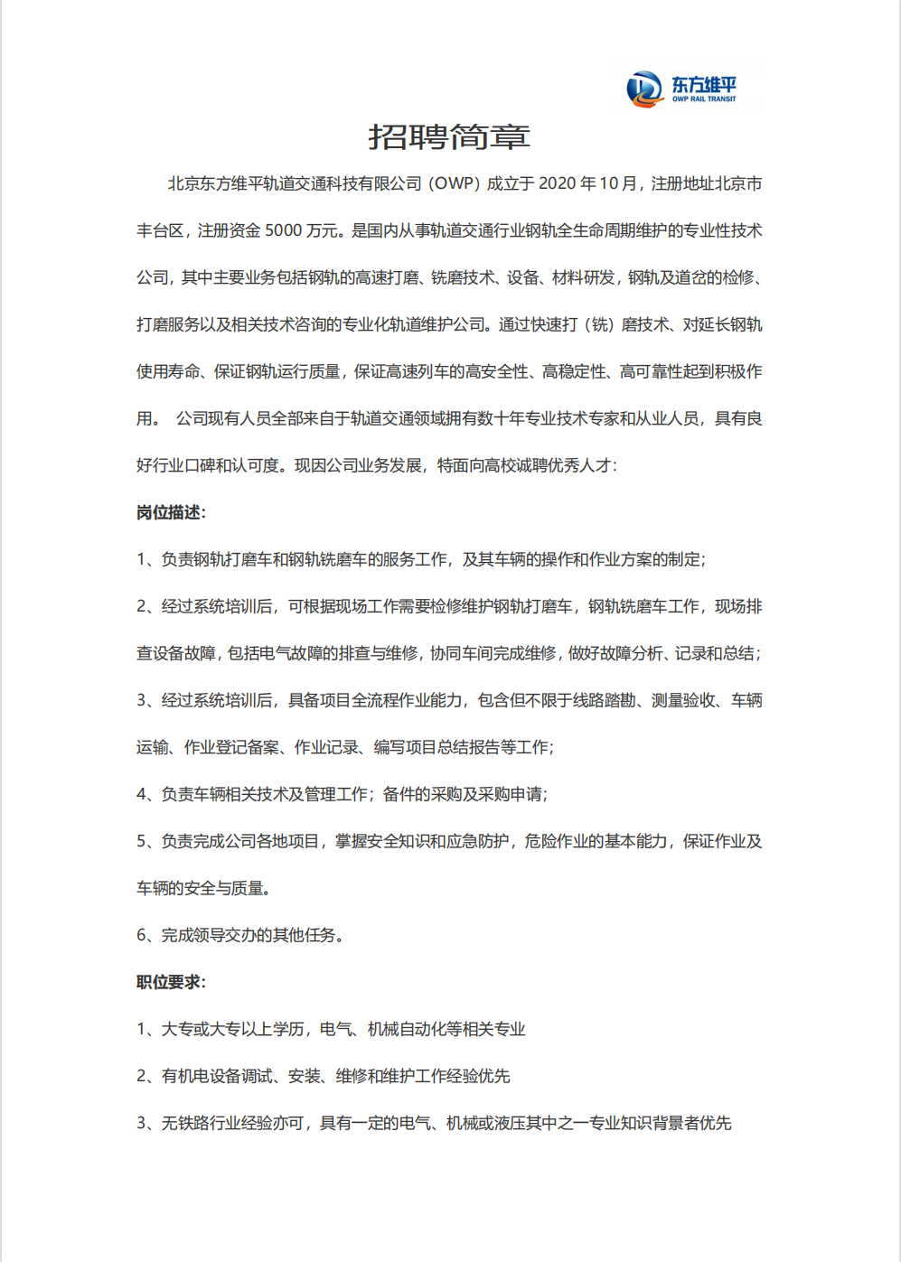 北京東方維平軌道交通科技有限公司2022年招聘簡章