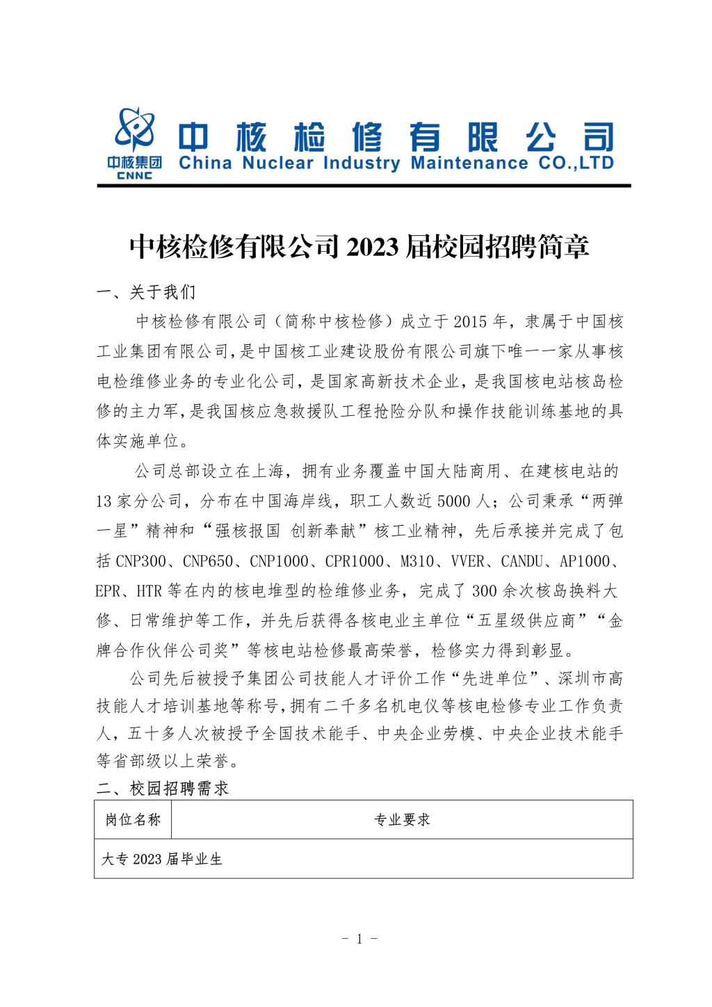 中核檢修有限公司2023屆應屆生招聘簡章