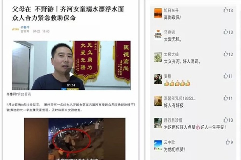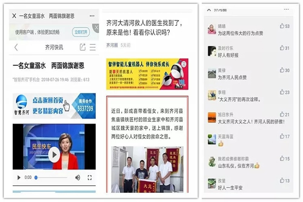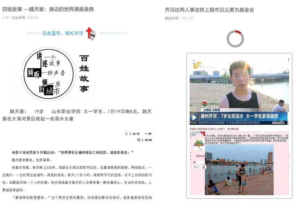 魏天豪見義勇為救溺水兒童的大愛善舉在暑假期間也傳遍家鄉齊河,各級新聞媒體、微信圈紛紛關注予以宣傳報道,贏得了社會各界的廣泛贊譽。齊河縣委宣傳部認證的微信公眾號“大義齊河”這樣評價魏天豪:最簡單的就是善良。用發現美的眼光看待這個世界,用自己的善良感知這個世界,這就是魏天豪的本性。一座城市的靈魂,不僅在于高樓大廈和車水馬龍,更在于集體的記憶和共同的氣質。當這些東西歷經數年,緩慢地積淀,不動聲色地縈繞在我們身邊,影響著人們的一言一行,成為共同的價值趨向。“身邊的世界滿是善良”,這就是這座城市一次次溫暖我們的原因。