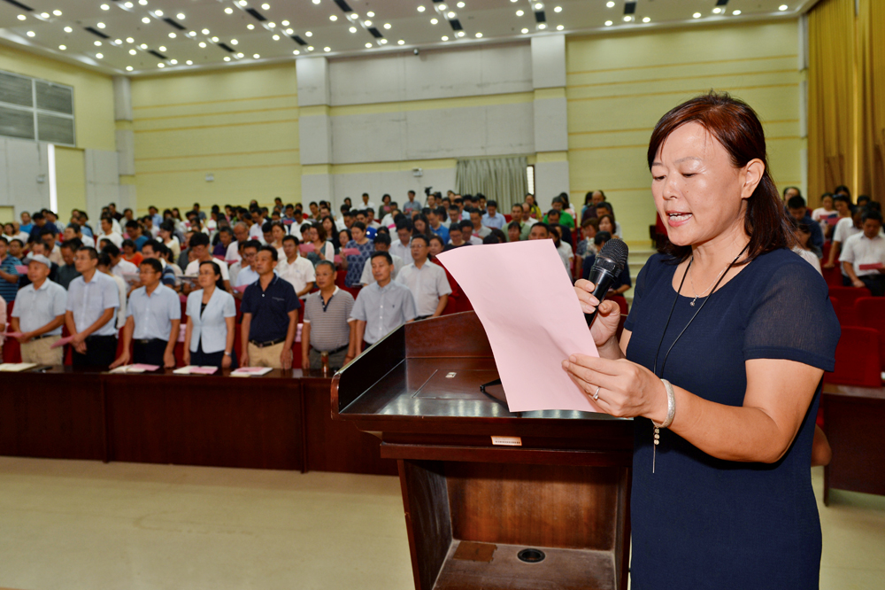 今年教師節的主題是:迎接黨的十九大,做好學生引路人。慶祝大會上,全體人員在鐵道運輸與財經管理系于政紅老師的帶領下,面對國旗,鄭重承諾:全面貫徹黨的教育方針,忠誠黨的教育事業,自覺踐行社會主義核心價值觀,教書育人,立德樹人。堅持以德立身、以德立學、以德施教,遵循教育規律,潛心教育教學,提高教學質量,做人民滿意的“四有”好老師,做好學生引路人,以優異成績向黨的十九大獻禮!