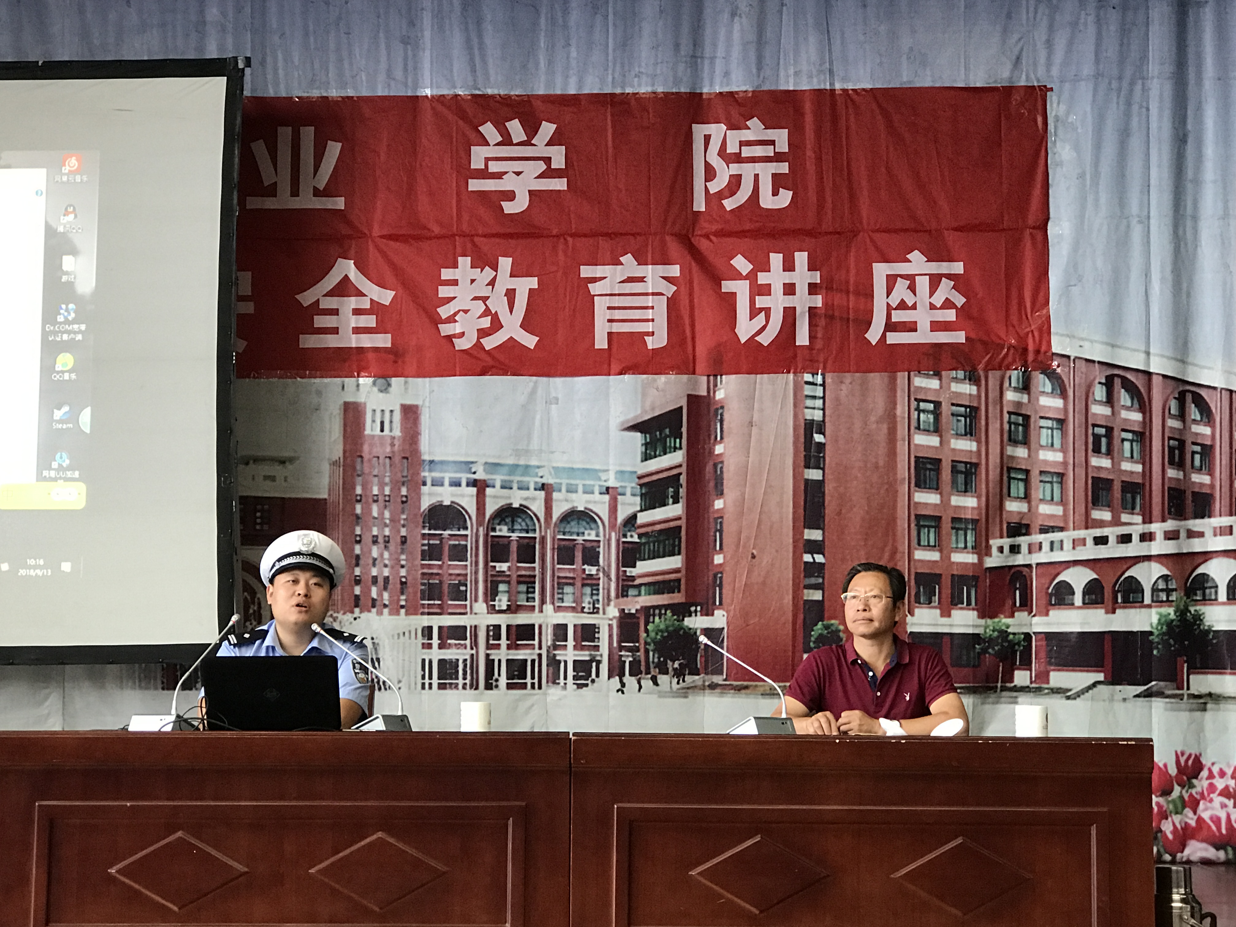為促進“平安校園”建設,提高新生的安全防范意識和自我保護能力,維護同學們的人身、財產安全。9月13-14日,學院邀請了公安、交通部門的專家,對2018級新生進行了安全教育講座。活動由安全保衛處處長徐國禮主持。
