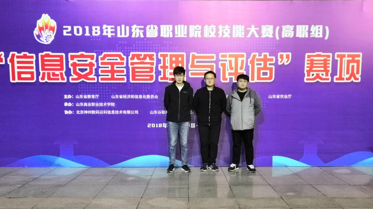 近日,2018年山東省職業院校技能大賽“信息安全管理與評估”賽項(高職組)比賽圓滿結束。我院計算機網絡技術專業學生張煒、滿建設、卜秋皓組成的參賽隊在劉志杰、李明生兩位老師的指導下,與來自全省21所高職院校的63名參賽選手同場競技。經過激烈競爭,我院代表隊最終獲得總分第三名的優異成績,摘得該賽項二等獎。