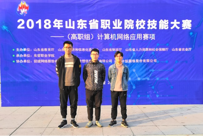 2018年山東省職業院校技能大賽“計算機網絡應用”賽項(高職組)比賽于11月10日-11日舉行,我院計算機網絡技術專業學生張嵩晗、侯學寶、丁兆坤組成的參賽隊在李憲偉、平寒兩位老師的指導下,與來自全省42所高職院校的126名參賽選手同場競技。經過激烈角逐,我院代表隊最終取得團體一等獎的優異成績。